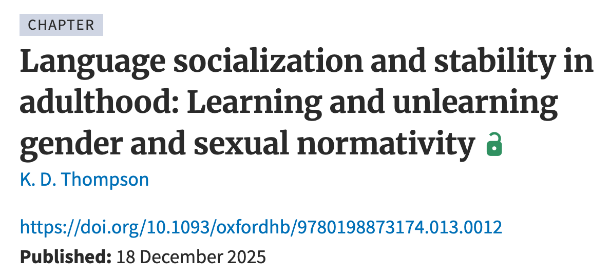 Based on my recent book chapter, “Language Socialization and Stability in Adulthood: Learning and Unlearning Gender and Sexual Normativity.” In The Oxford Handbook of Language Socialization.